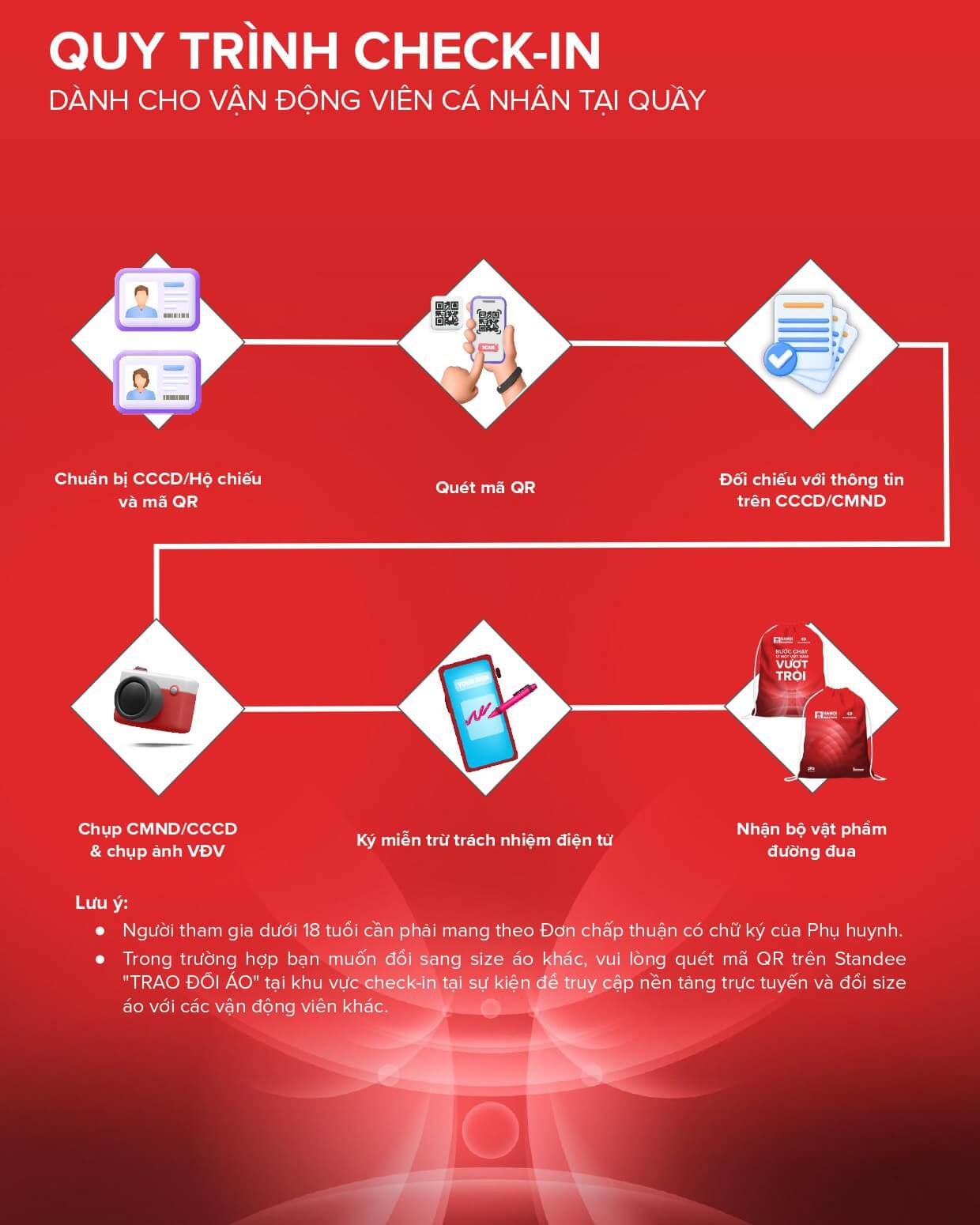 Vui lòng xem và lưu lại Quy trình check-in vận động viên cá nhân dưới đây để quá trình đăng ký tại sự kiện của bạn được nhanh chóng hơn và thành công tham gia vào đường đua năm nay nhé!